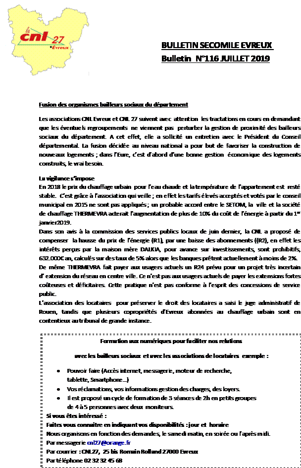 J’adhère à l’Association des Locataires CNL Evreux – 1er syndicat de locataires de France Cotisation annuelle: 20 euros – Chèque libellé au nom de la CNL Evreux À envoyer à: Association des Locataires CNL Evreux – 11 rue de la Bruyère - 27000 Evreux
