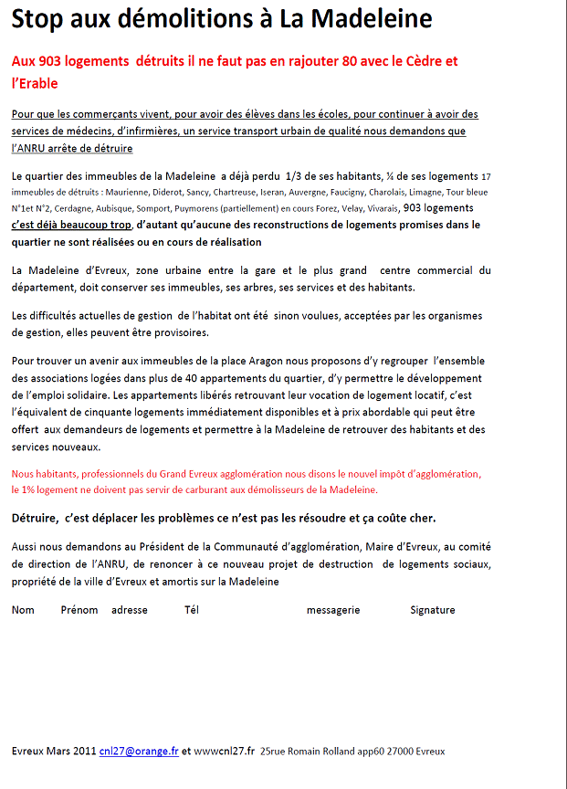 Contact : CNL – 25 rue Romain Roland – Apt 60 – Evreux Permanences : 1er samedi de chaque mois de 10 h à 12 h Messagerie : cnl27@orange.fr Site : cnl27.fr |